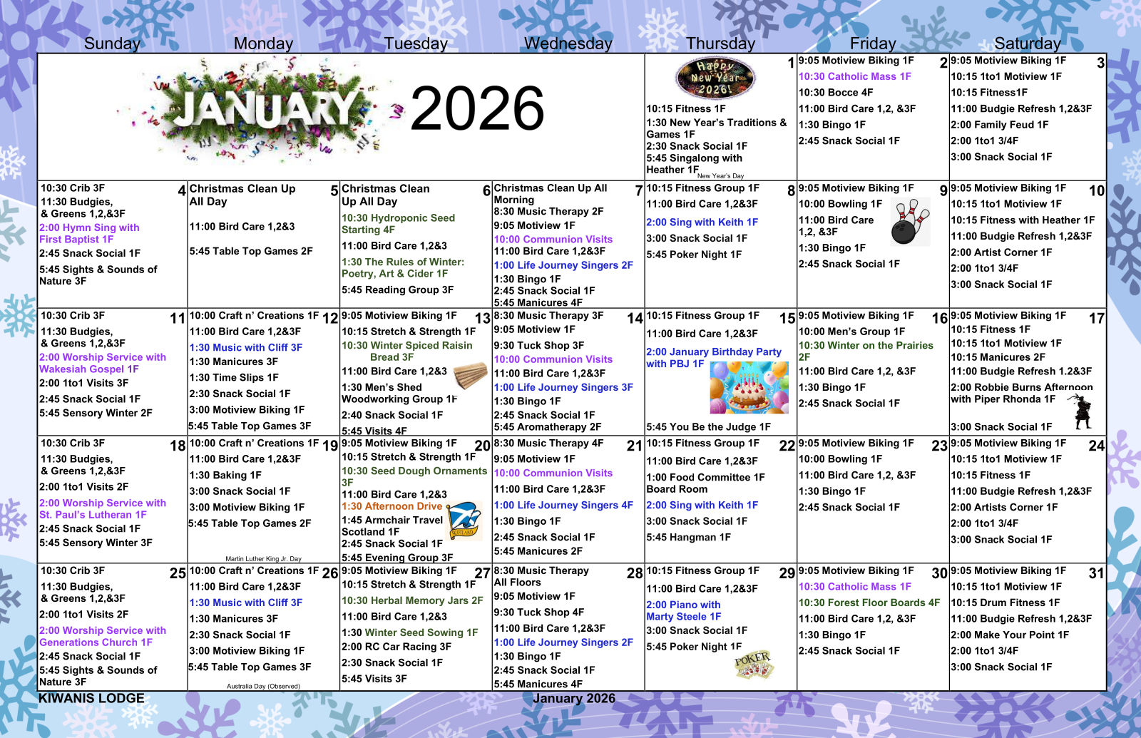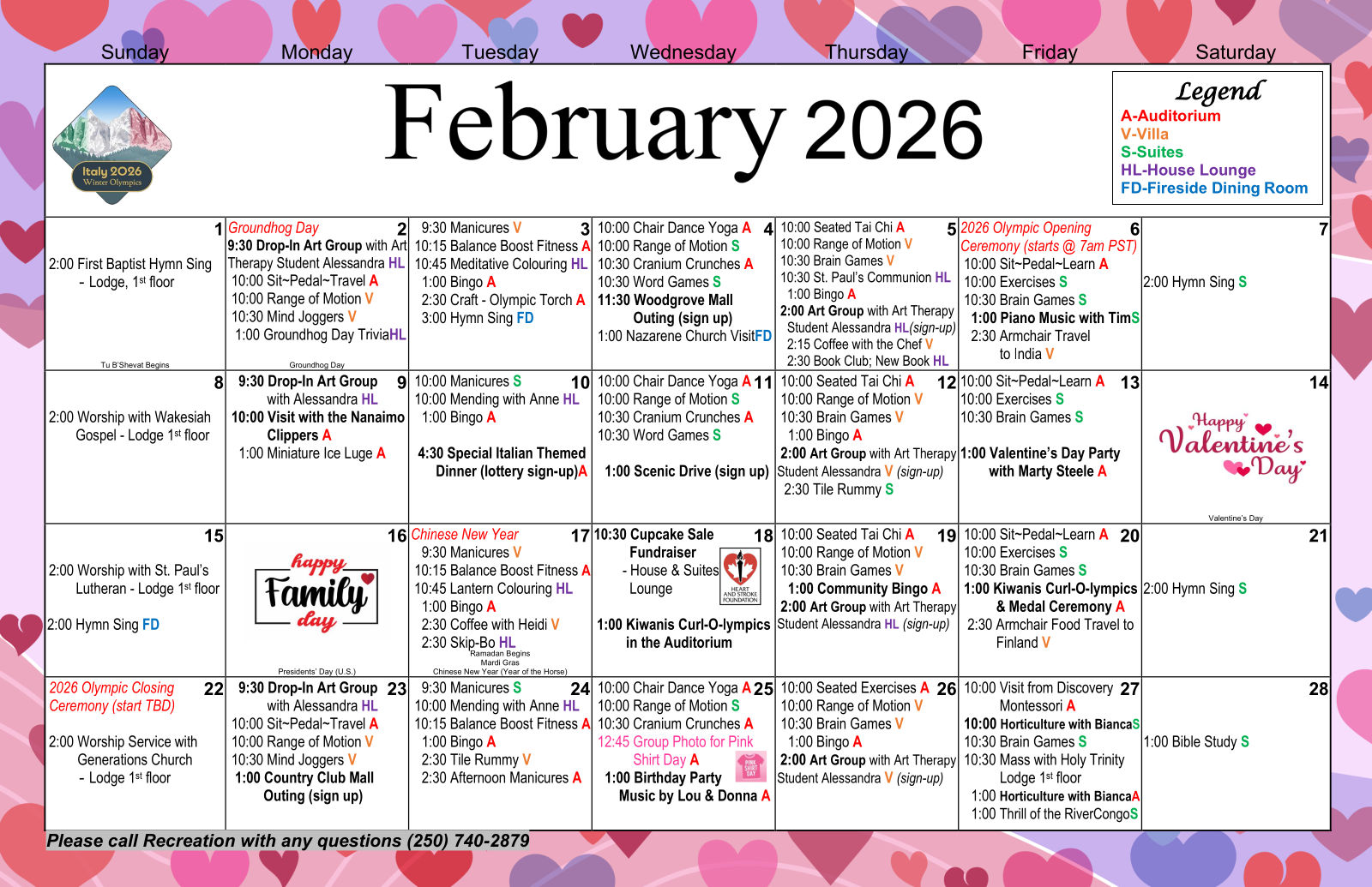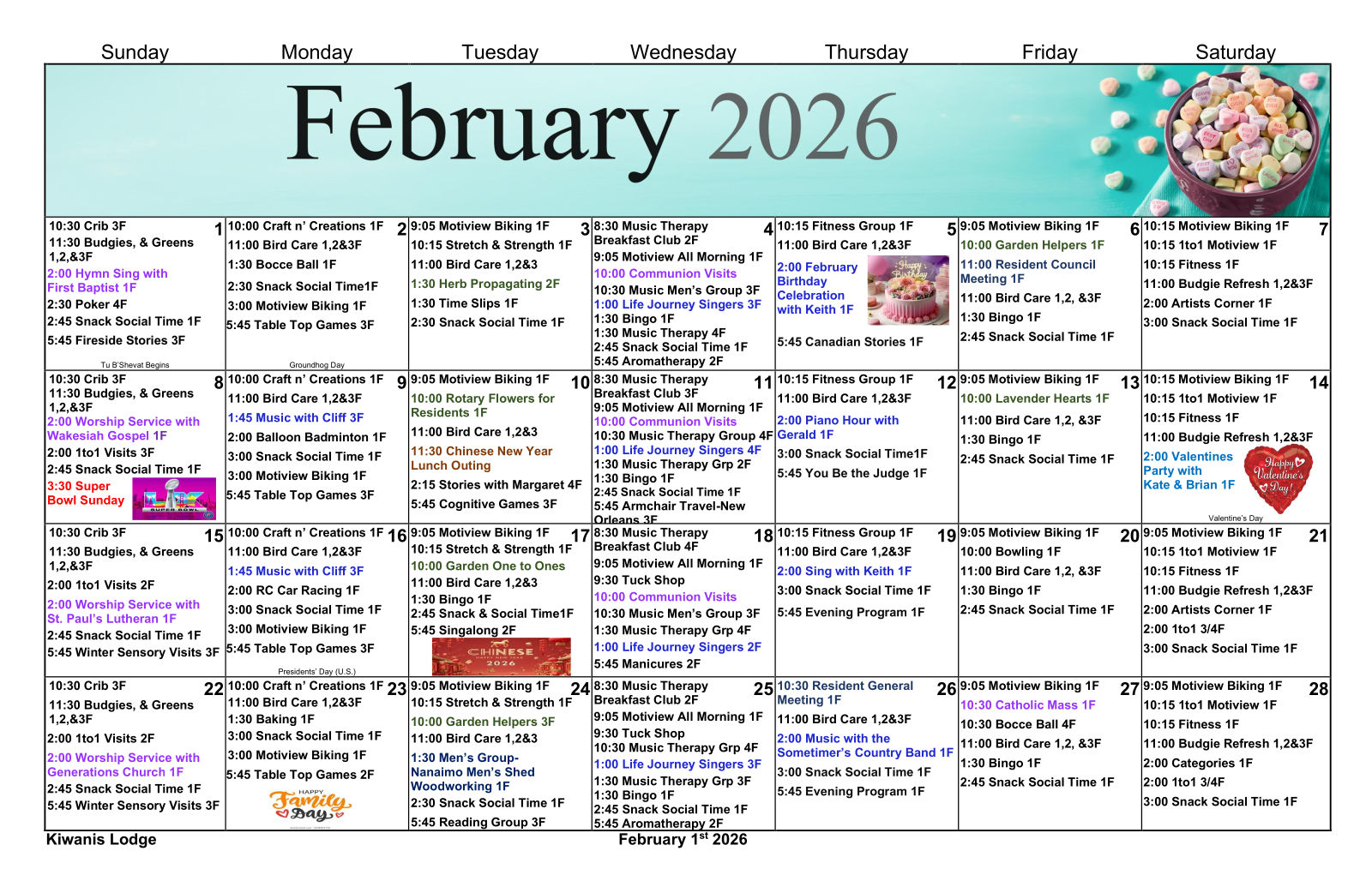 At Kiwanis Village we strive to provide therapeutic recreation programming that reaches past simply “keeping people busy” or “passing time.” Monthly evidence based, and traditional programs create and maintain a genuine connection to their community. Our popular programs, events and activities are well supported and reflect the ideas and desires of the residents. We work directly with individual wants and needs and there’s fun for introverts and extroverts alike.